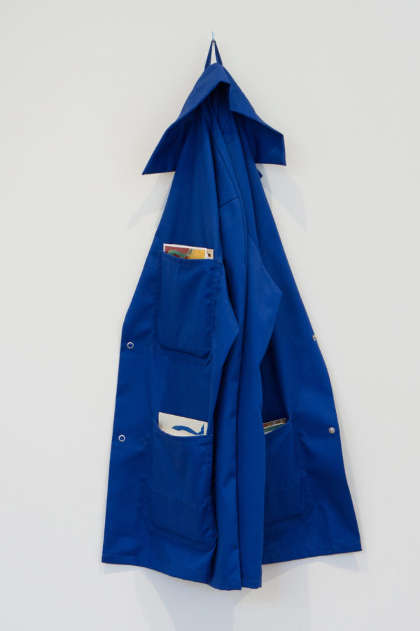 - Old Masters (Henri Matisse), 2019, veste de travail, cartes postales, 100 x 40 x 20 cm