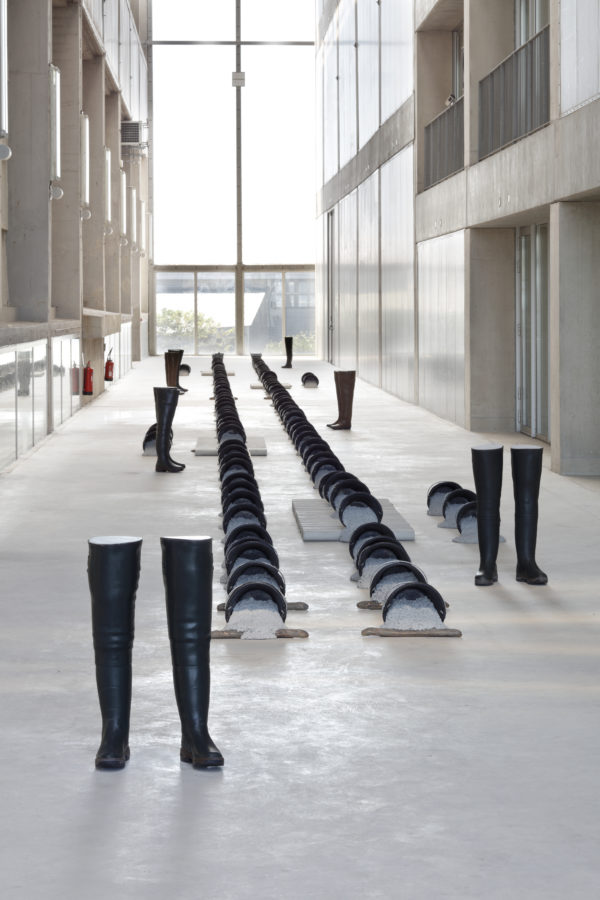 Androgynous boots, a chaotic cadence, a bell ringing at random, haunting smells, dripping oil: if the exhibition sometimes gives off a game-over atmosphere, we also find in it exuberant recollections of the christening of ships, and shadowy crates morphing into gigantic liners. Delphine Reist’s objects, then, are populated by ghosts, but they are also metamorphosed by a mechanism whose blend of the erotic and the burlesque embeds them firmly in our present.
