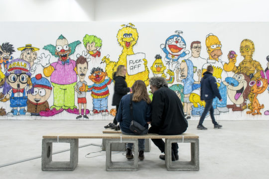 « De leur temps » comprend des œuvres réalisées, dans leur grande majorité, au cours des cinq dernières années. Œuvres d’atelier pour la plupart, elles s’accrochent souvent aux murs dans l’intimité des habitations, dans des bureaux ou parfois des réserves en attente d’exposition. Réunis en association, les collectionneurs de l’ADIAF ont choisi de partager leur passion et prêtent ponctuellement leurs pièces à des institutions. Peintures, dessins, sculptures et photographies, certaines acquisitions sont aussi des vidéos, des performances ou des protocoles à réactiver. Les collectionneurs se lient aux artistes au travers de différents contrats qui repoussent les limites de l’œuvre, leur matérialité et leur durée. Depuis le fameux ready-made de Marcel Duchamp de 1917, un urinoir du commerce retourné, signé puis déplacé dans une exposition, nombreux sont les artistes iconoclastes qui, à l’instar de Saâdane Afif, manipulent les symboles et considèrent l’art dans sa fonction critique. Par-delà la provocation, c’est l’économie de l’œuvre qui entre en scène, sa valeur marchande liée à sa médiatisation, même !
