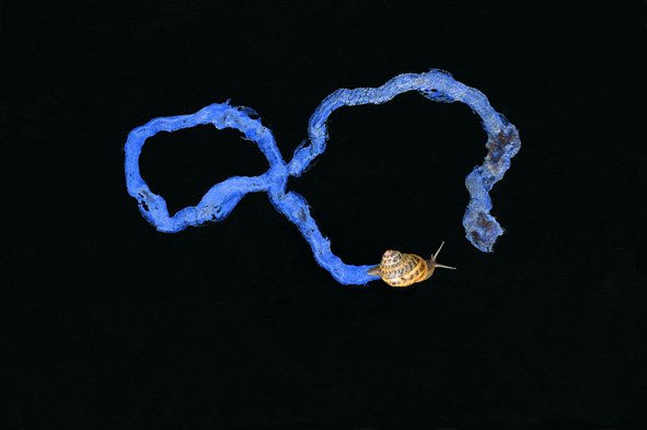 Ce petit singe bleu de Christine Deknuydt est-il un cousin de la célèbre « souris verte qui courait dans l’herbe » ? Et l’escargot qui laisse sa trace baveuse sur la toile de Bertrand Gadenne, l’« escargot tout chaud » trempée dans l’huile et l’eau ? Ces porcelaines de Matali Crasset en forme de feuilles de papier plié, sont-elles la vaisselle de l’homme qui vit dans la « maison en carton » ? Les aquarelles réalisées par des cyanobactéries de Nicolas Floc’h, le « clair de la lune » de la chanson sur l’ami Pierrot ? Les arbres de Didier Faustino, la forêt du Petit Chaperon Rouge ?
