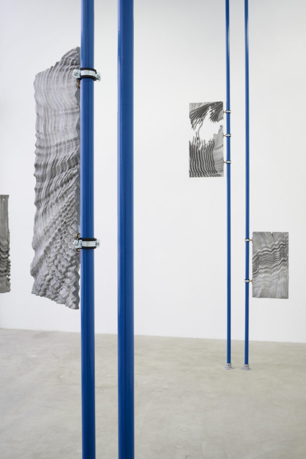 Le titre de l’installation Le Chant du Styrène (2013) est un hommage au film éponyme d’Alain Resnais, réalisé pour l’entreprise Pechiney, sur la fabrication des plastiques modernes, qui rappelle leur origine fossile. L’œuvre de Nicolas Deshayes immortalise par un moulage en aluminium des plaques de polystyrène bon marché déjà utilisées, traitées ou recyclées. Ce matériau souvent utilisé pour les décors de films présente des reliefs différents qui font penser à des courbes de niveau mettant en scène leur lente érosion. Accrochés à des barres en acier, ces volumes flottants et ambigus mettent en tension un processus de fabrication industriel qui laisse songeur quant à l’épuisement des ressources naturelles.